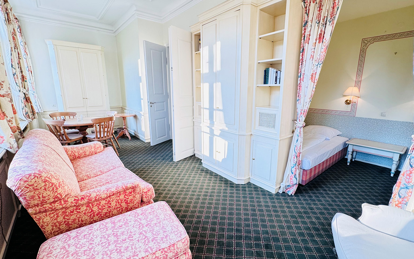 Jedes Detail, von den Farbnuancen der Wände und Vorhängen bis zur Auswahl des Mobiliars, ist mit Bedacht gewählt. Tauchen Sie ein in das harmonische Zusammenspiel von Farben: leuchtendes Gelb, kräftiges Rot oder zartes Grün setzen Akzente und verleihen jedem Raum eine individuelle Note. Ob gemütliches Zimmer oder großzügige Suite, ob edles Ledersofa oder eine Kombination in warmen Beige - alles wurde so arrangiert, dass es das exklusive und gleichzeitig familiäre Ambiente des Schlosses unterstreicht.